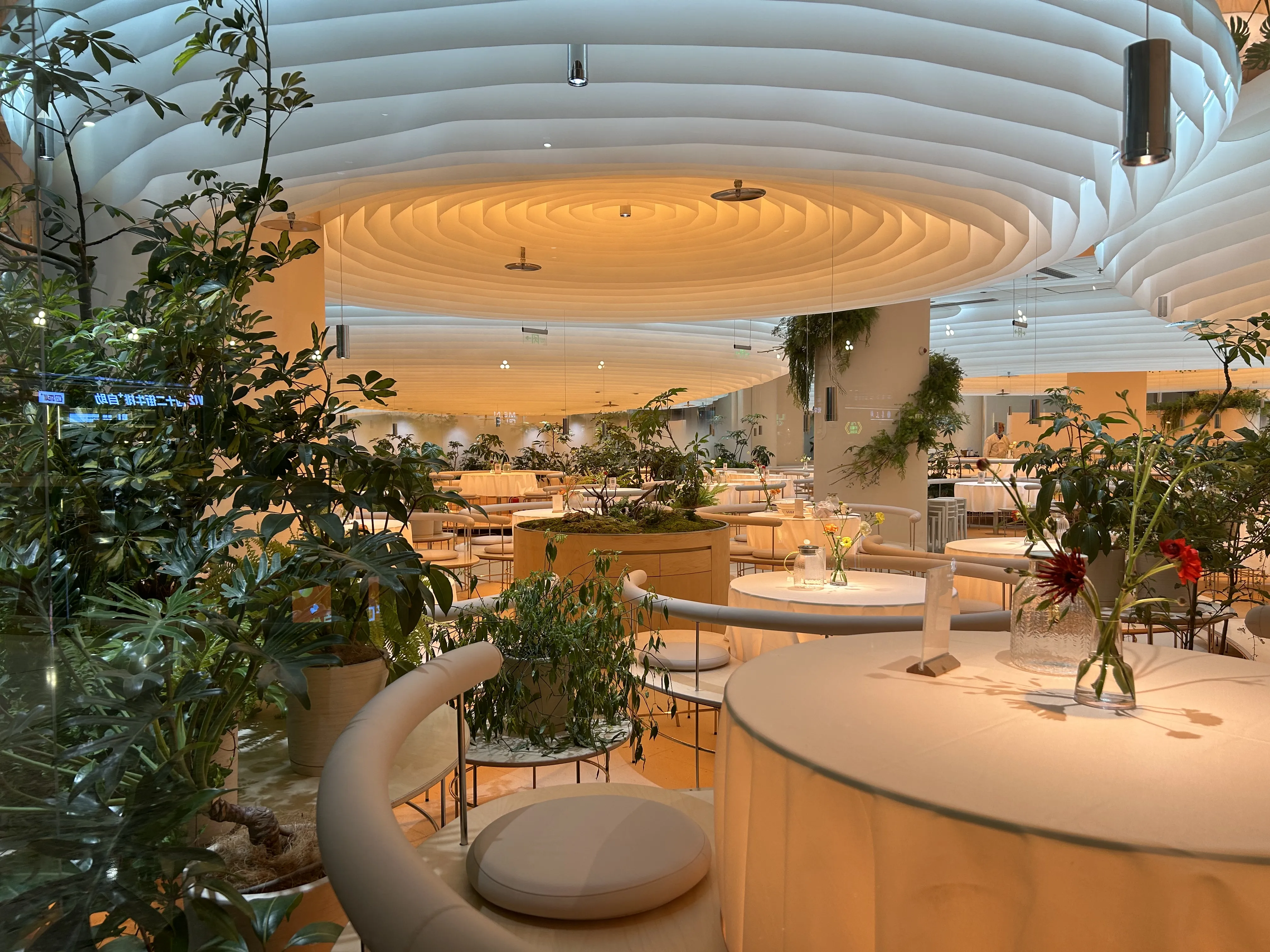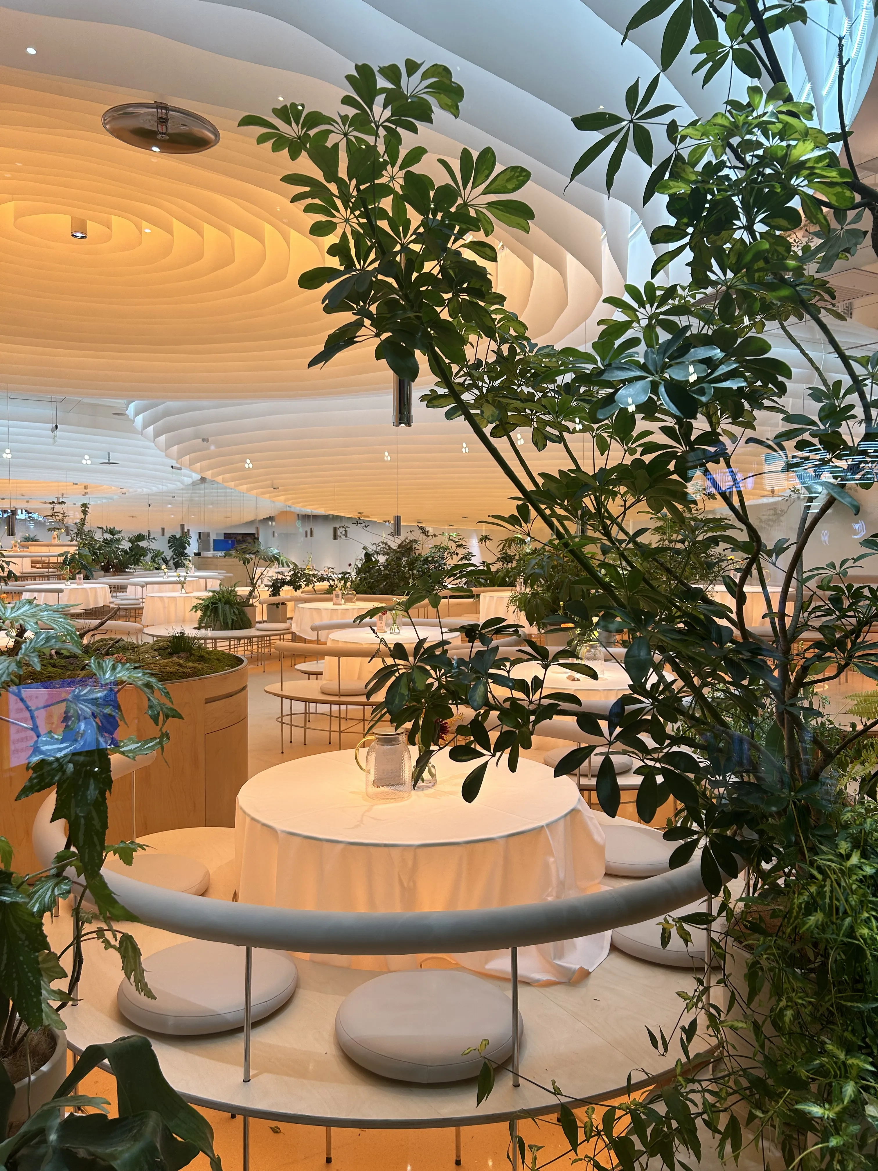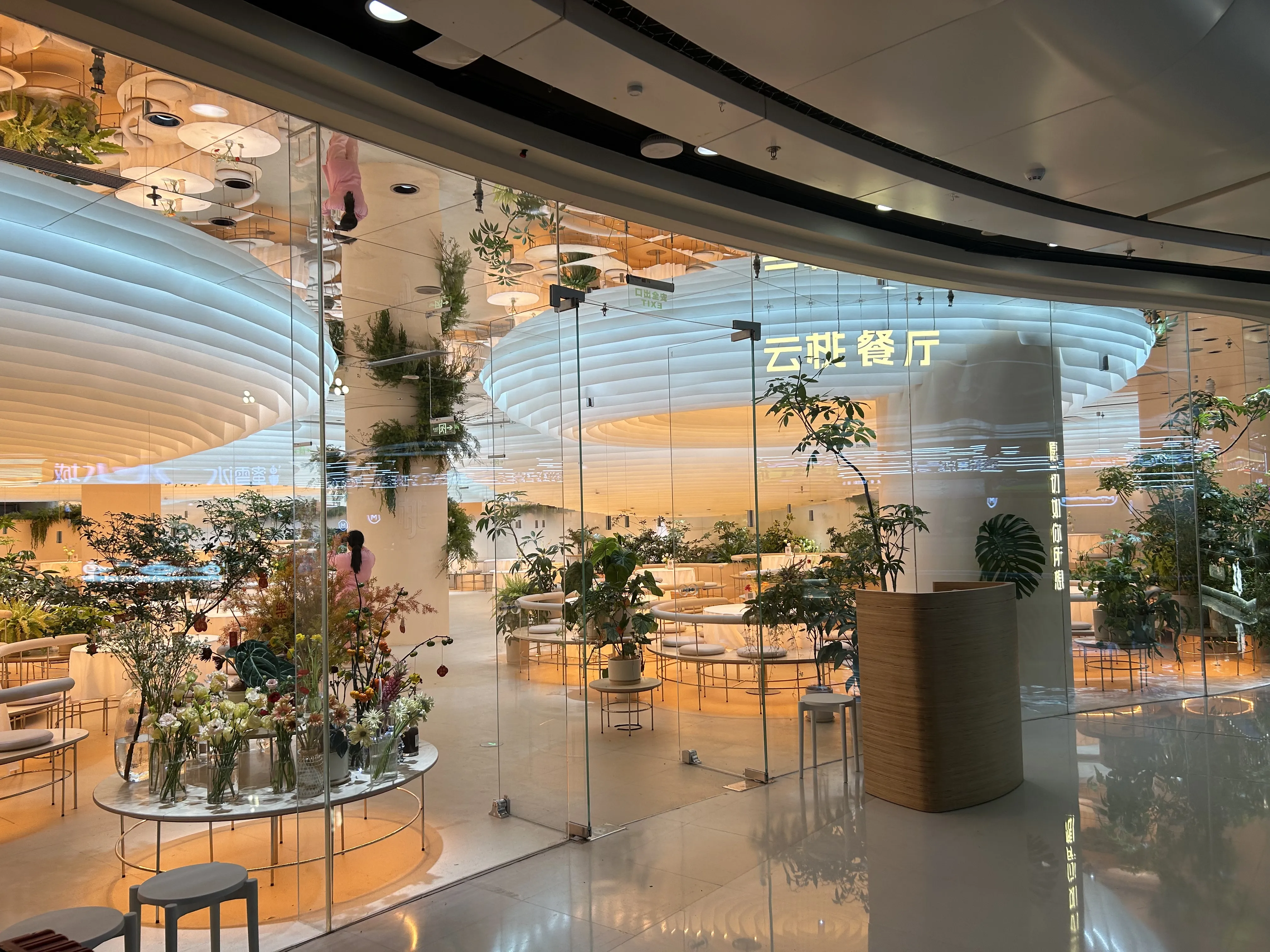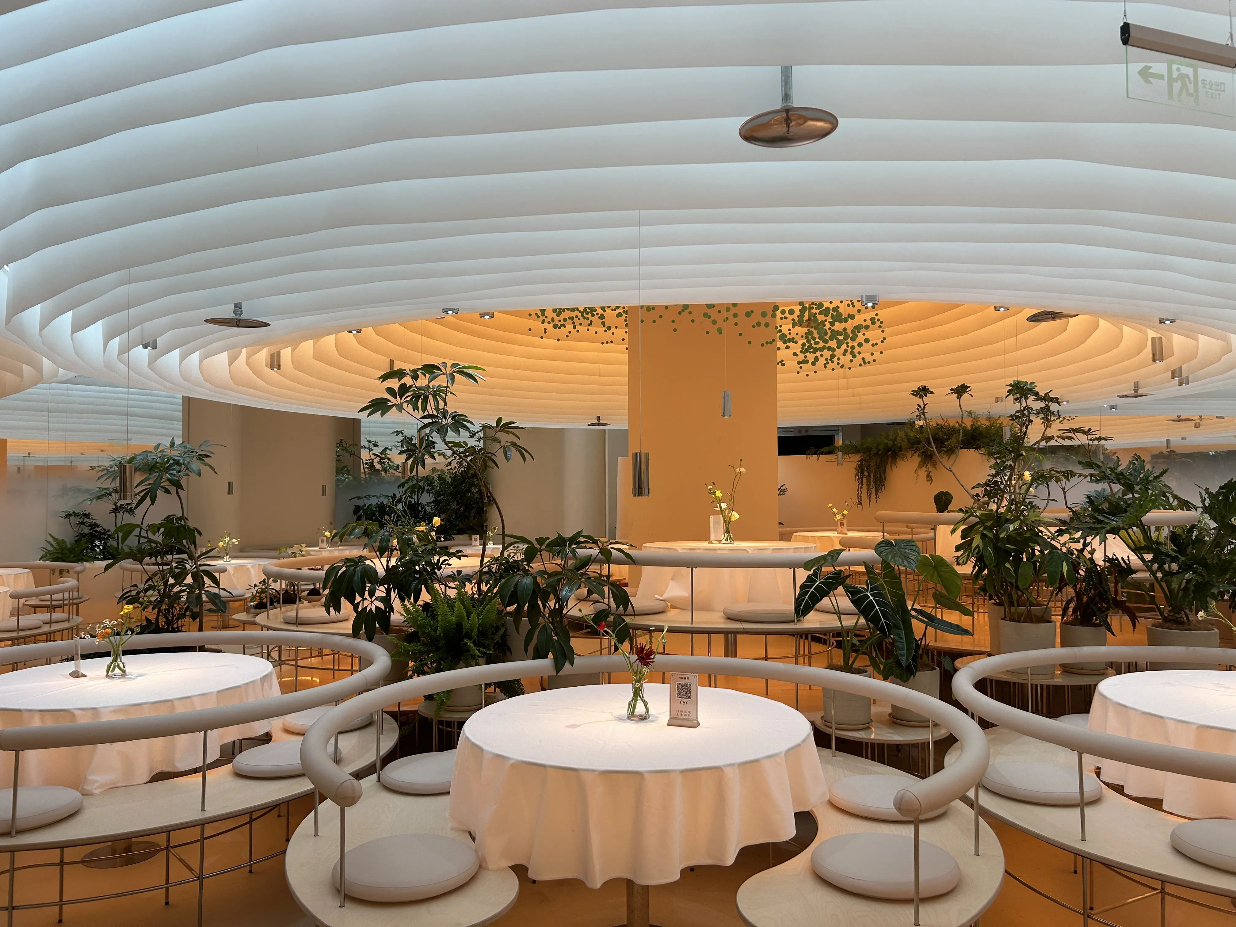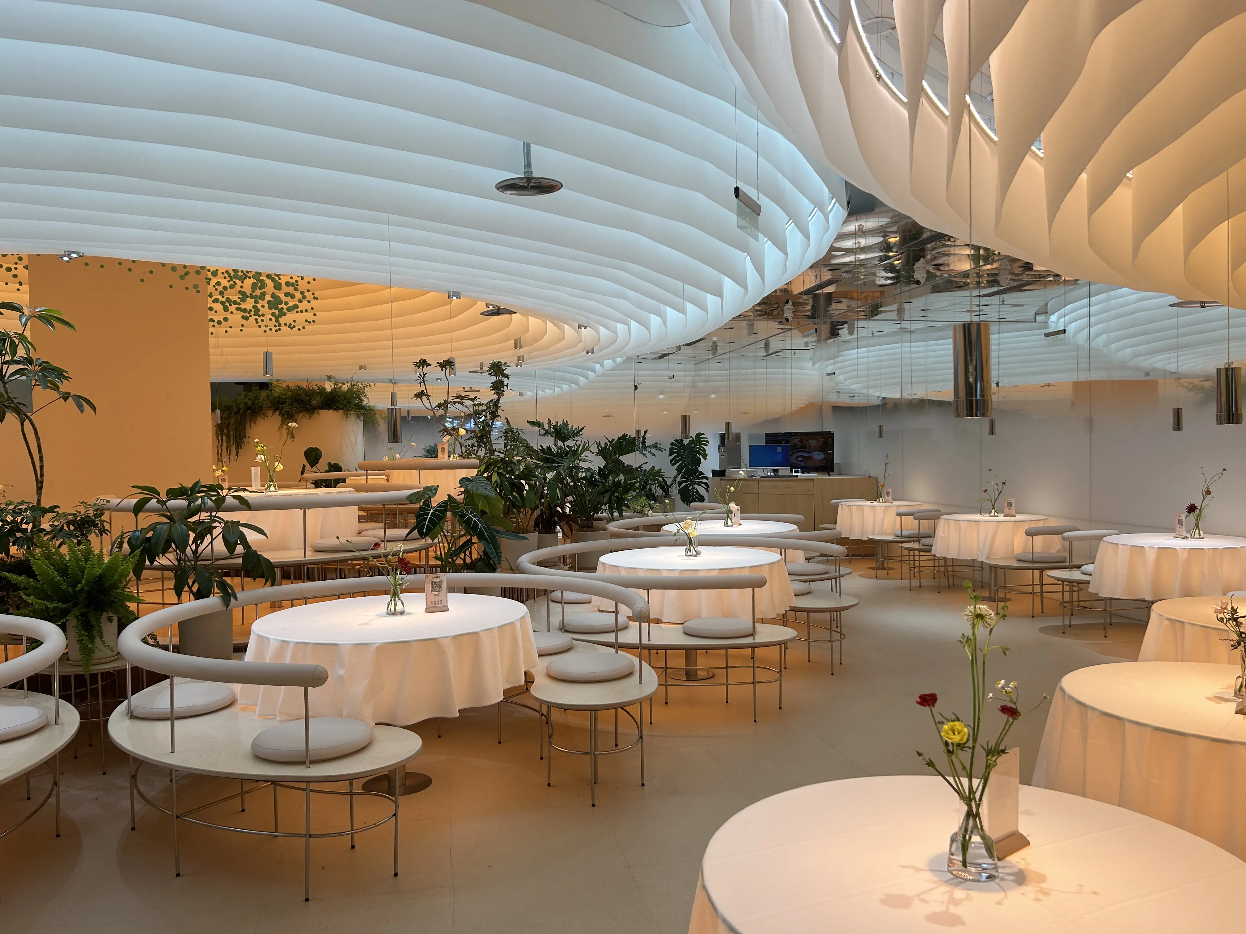 云桃餐厅北京万达店,定位为北京|闹市中的丛林餐厅,灯光设计的整体思路是为环境氛围增光添彩,店内以大量的白色调做基础,配合大量的垂挂面料装饰,层层叠叠,面料分内外两区,冷暖颜色对比,通过定制的高亮度侧发光灯带,提供充足的照明,较高氛围感很强!